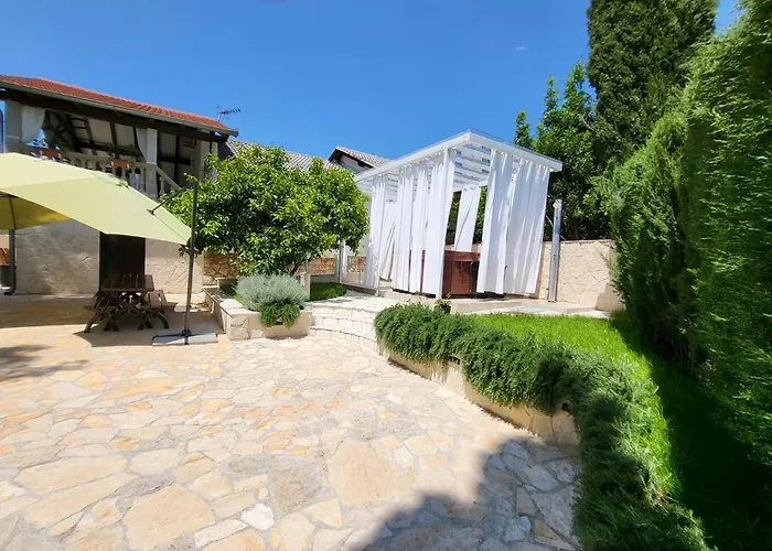 The kitchen amenities at Villa Roko - Luxury Villa 60M From Beach! feature an electric kettle, a refrigerator, and kitchenware, provided in an outdoor dining area. The nearest bus stop, Zdrelac 3, is just 0.8 km away. Guests can experience a relaxing stay with a Jacuzzi, or indulge in snorkelling, diving, and darts.